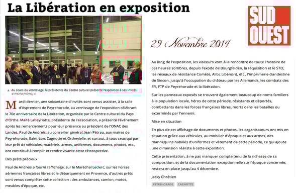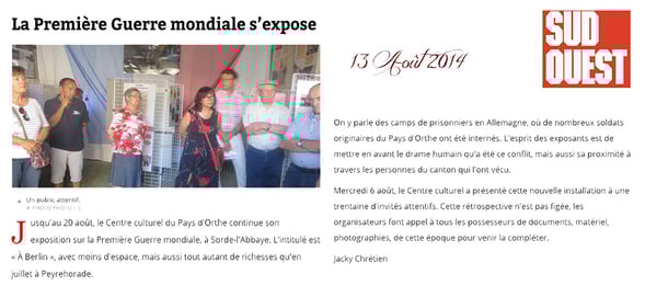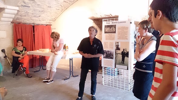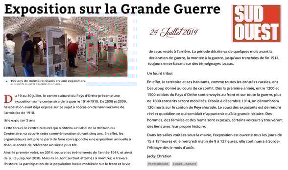 Ce que vous ne verrez pas dans la presse locale qui n'a pas répondu à notre invitation ... Les artistes associés du centre culturel du pays d'Orthe font dans "l'évènementiel" discret et modeste, cependant nous avions invité des passionnés d'histoire, d'histoire locale, d'histoire sociale qui avaient participé à l'élaboration de notre exposition, et nous étions une bonne cinquantaine ce samedi 19 juillet à échanger nos connaissances sur l'épopée de 1914 qui a vu les enfants de l'Europe s'entretuer sur un front de plusieurs centaines de kilomètres. Un bilan très lourd et un bouleversement annoncé des structures sociales de la vieille Europe. Que soient remerciés ici tous ces participants ainsi que M. Paul de Andréis, directeur de l'ONAC des Landes et M. Jean-Pierre Brèthes de l'Amicale du 34ème RI de Mont-de-Marsan qui nous ont fait l'honneur de leur présence, ainsi que Mmes Monique Boneil et Rose Duthil et M. Francis Batrio de l'Association culturelle de Saugnac et Cambran, MM. Moulène, Michel Daverat et Didier Sakellaridès de Peyrehorade pour leurs prêts d'objets et documents que nous exposons dans les salles des gardes (ordinairement "salles voûtées") du château d'Orthe à Peyrehorade tous les après-midi de 15 à 18h jusqu'au 30 juillet.
