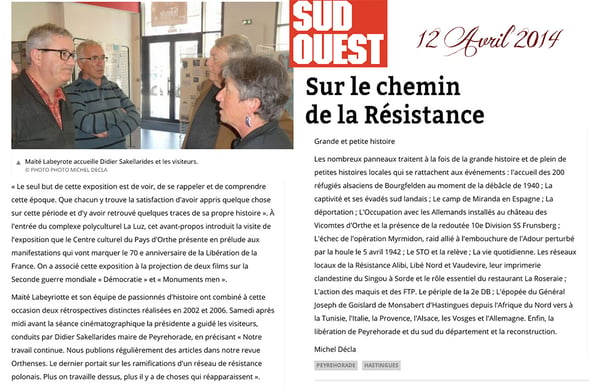 À cette occasion, le Centre culturel du pays d’Orthe installe dans les halls du cinéma son exposition 2002-2006 sur le sujet. Ceux qui ne la connaissent pas pourront ainsi la découvrir. Informations complète sur le site :www.peyrehorade-cinema.fr