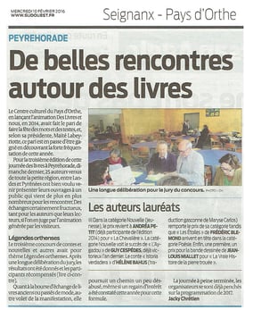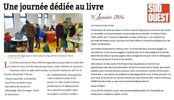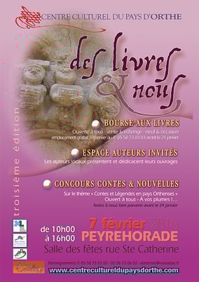 À l’occasion de notre journée consacrée aux livres le 7 février 2016 (salle des Fêtes rue Ste-Catherine à Peyrehorade – de 9h à 16h), il a été convenu d’organiser un concours de contes et nouvelles (contes, nouvelles, poésie et bande dessinée) où la participation la plus large est souhaitée. Cette année, nous avons choisi d’explorer les «Contes et légendes orthenses».