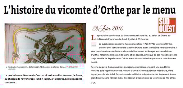 On l’appela aussi En Peri, Rocca, château du Roc, château de Montréal (pour effacer sans doute sa véritable propriétaire) il est devenu aujourd’hui tout simplement le château d’Orthe. Tant sous l’Ancien Régime qu’après la Révolution, et jusqu’à nos jours, il a rythmé la vie locale et a accueilli quantité d’activités et occupations diverses. C’est ce que nous nous proposons d’évoquer le 4 avril prochain (à 15h dans le salon de Diane du château d’Orthe à Peyrehorade).