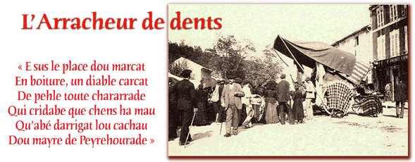 À la fin du XIXe siècle, il y a foule sur la place de la Liberté à Peyrehorade devant la voiture de l'arracheur de dents, ce "grand sorcier" extravagant comme le stigmatise Isidore Salles, qui se démène pour attirer ses "victimes" consentantes.