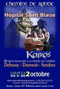 L'association Chemins de Ronde poursuit sa promenade. Encore une fois, l'excellence donnera le LA, avec le Quatuor à cordes Kairos, dans un programme de trois quatuors à cordes. Claude Debussy, bien sûr, ce "Claude de France" ainsi nommé comme pour affirmer le modèle d'une sensibilité proprement nationale. Lucien Durosoir dont la musique, récemment publiée, s'est révélée à la critique qui l'a saluée en ces termes: «Comment se fait-il qu'on en soit encore à ne parler, pour cette période de notre histoire, que de Ravel et des amusantes tentatives du groupe des Six? Durosoir doit absolument être redécouvert.» À son tour, le compositeur basque Michel Sendrez a affronté ce genre redoutable : son Quatuor n° 1, a été créé en septembre dernier aux concerts de l'Académie Ravel de Saint Jean de Luz. Cette croisée des chemins sera donc riche en surprises et découvertes, en talents assurés d'auteurs et d'interprètes.