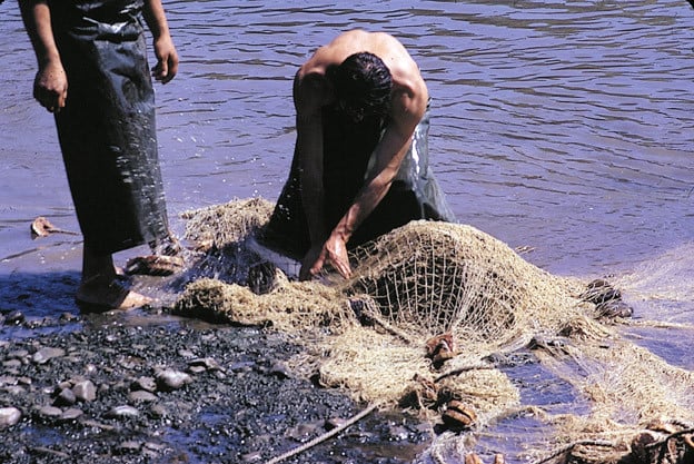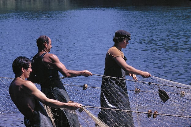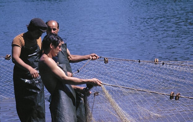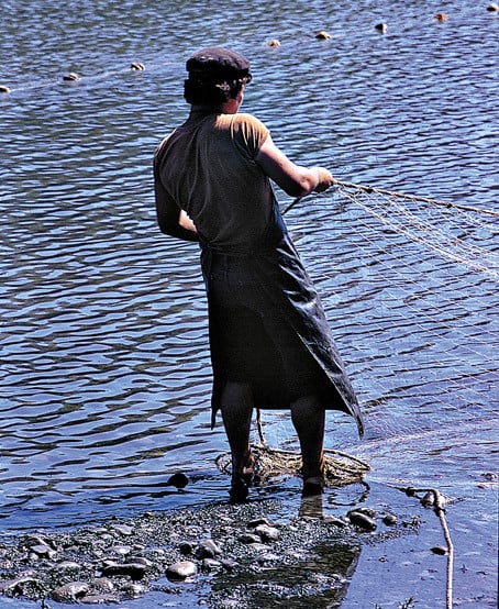 On pêche par équipes de quatre au moins, avec un couralin. Certaines sont formées de cinq ou six hommes pour permettre un repos hebdomadaire par roulement. Le saumon se pêche de janvier à juin, à la traîne : un immense filet, long de 160 mètres sur 7 ou 8 mètres de large, à mailles réglementaires de onze centimètres, bordé en bas d’un filin de boules de plomb, en haut d’un fil portant des rondelles de liège en surface.