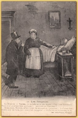Le médecin : Voyons, la malade ne va pas mieux ? C'est bien étonnant ! Vous avez pourtant bien appliqué les sangsues sur l'estomac ?
