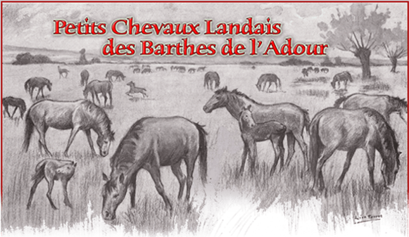 e souvenir de cette originale et charmante cavalerie que les voyageurs de la ligne Dax-Bayonne remarquent, presque en toute saison, dans les vastes prairies du bord de l’Adour, aux environs de Saubusse, évoque un poétique tableau. Ces prés - des “communaux” pour la plupart - sont appelés des “barthes” dans la région. Le mot original serait ibère, ce qui se conçoit en ce Sud-Ouest de la France, qui est la très ancienne Aquitaine ibérique. Il signifierait taillis : taillis de saules et d’aulnes, arbres des lieux humides, sans oublier la végétation complémentaire mêlée à l’osier, joncs, prêles et salicaires, iris de marais dont la gracieuse fleur d’or, ou fleur d'iris jaune, a donné en Île de France la fleur de lys du blason de la province et des ducs, devenus ensuite rois de France.