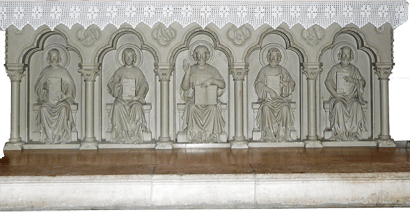 Comme on peut le constater plus haut, sur une photographie datant de la dernière décennie du XIXe siècle, cinq statues sont placées sur des culots , au centre de chacun des cinq pans du chœur, devant des niches peintes en trompe-l'œil. De ce groupe, il ne reste aujourd'hui que quatre personnages (la cinquième statue a disparu) dont deux encadrent l'intérieur de la porte d'accès de l'église.