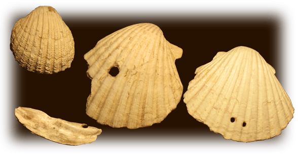 L’une d’elle est décrite ainsi dans le rapport de fouilles : “Le défunt portait sur l’épaule gauche, une très belle coquille de pecten munie de trois perforations. La
