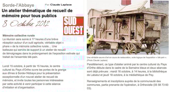 Lundi 15 octobre, à partir de 15 heures, le Centre culturel du Pays d'Orthe ouvre les portes de la grange aux dîmes à Sorde-l'Abbaye pour la présentation exceptionnelle d'un nouvel atelier de recueil de mémoire, et invite toutes les personnes intéressées par cette activité à venir participer à cette séance d'initiation et d'organisation.