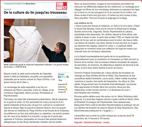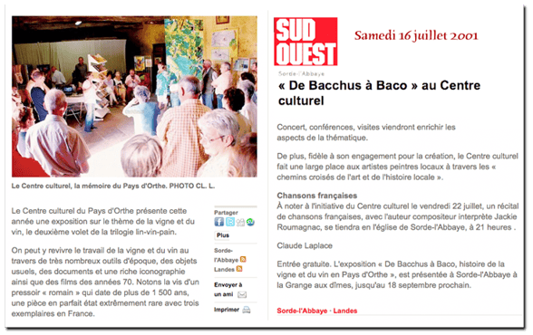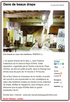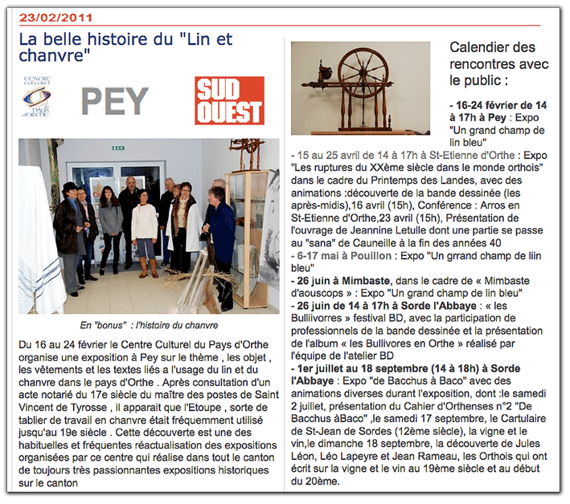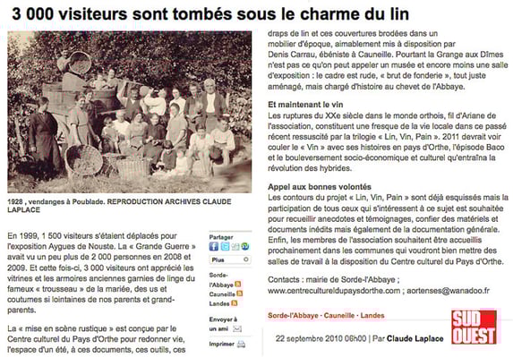 Le Centre culturel vous en propose une exposition qui en retrace les étapes, à la Grange aux Dîmes, à Sorde l'Abbaye, du 1er juillet au 18 septembre 2011.