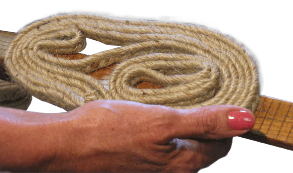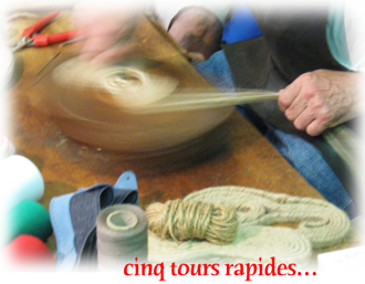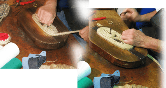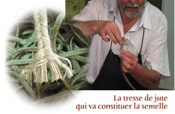 Dans son atelier de Mauléon, il tresse d’abord le jute qu’il formera à la mouleuse centenaire qui a vu trois générations de sandaliers exécuter le même geste précis : cinq tours rapides et voilà une semelle prête à être cousue puis vulcanisée (trempée dans le caoutchouc liquide) avant de recevoir la toile, cousue à la main elle aussi.